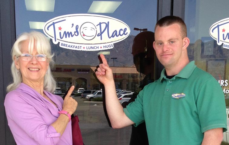 A few months ago, I visited my friend Julie in Albuquerque, NM. Two of Julie’s therapy clients are young men with Down syndrome, so Julie is in the “DS Loop” there. “Do you want to have lunch at Tim’s Place? Do you know about that restaurant?” she asked. I had heard about Tim’s Place. “Are you kidding? I wouldn’t miss that for anything!” So we went, met Tim, were serenaded by him, ate lunch (of course), and watched him “work the joint.” It was a totally fun time, especially since two young adults with DS were in our party and were old buddies of Tim’s.