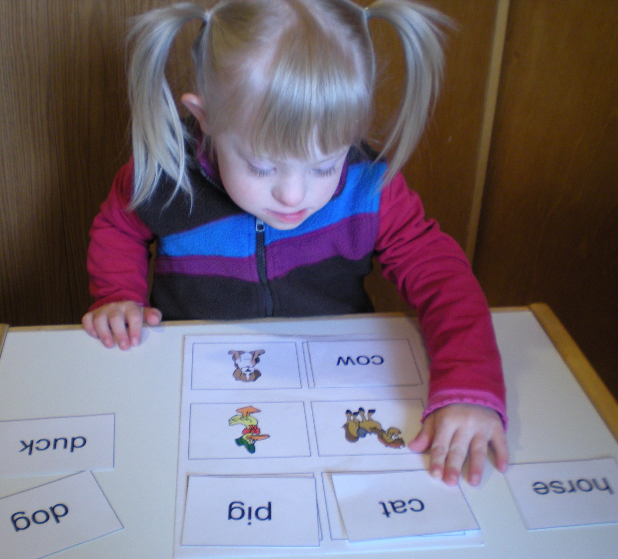 Because she was truly nonverbal, Elizabeth’s teachers went for very low expectations in the beginning. I coached her mom to make two videos of Elizabeth and burn them on a DVD for the teachers. The first was a video of her making the signs for each word in the story she would be reading in the second video (our learners with DS are often…umm…”creative” in their renditions of signs! I wanted to make sure the educators knew her versions of those signs.) The second video was of her signing each word as her mom pointed silently to each. As you can imagine, things shifted dramatically for Elizabeth when her teachers viewed the DVD. Of course.