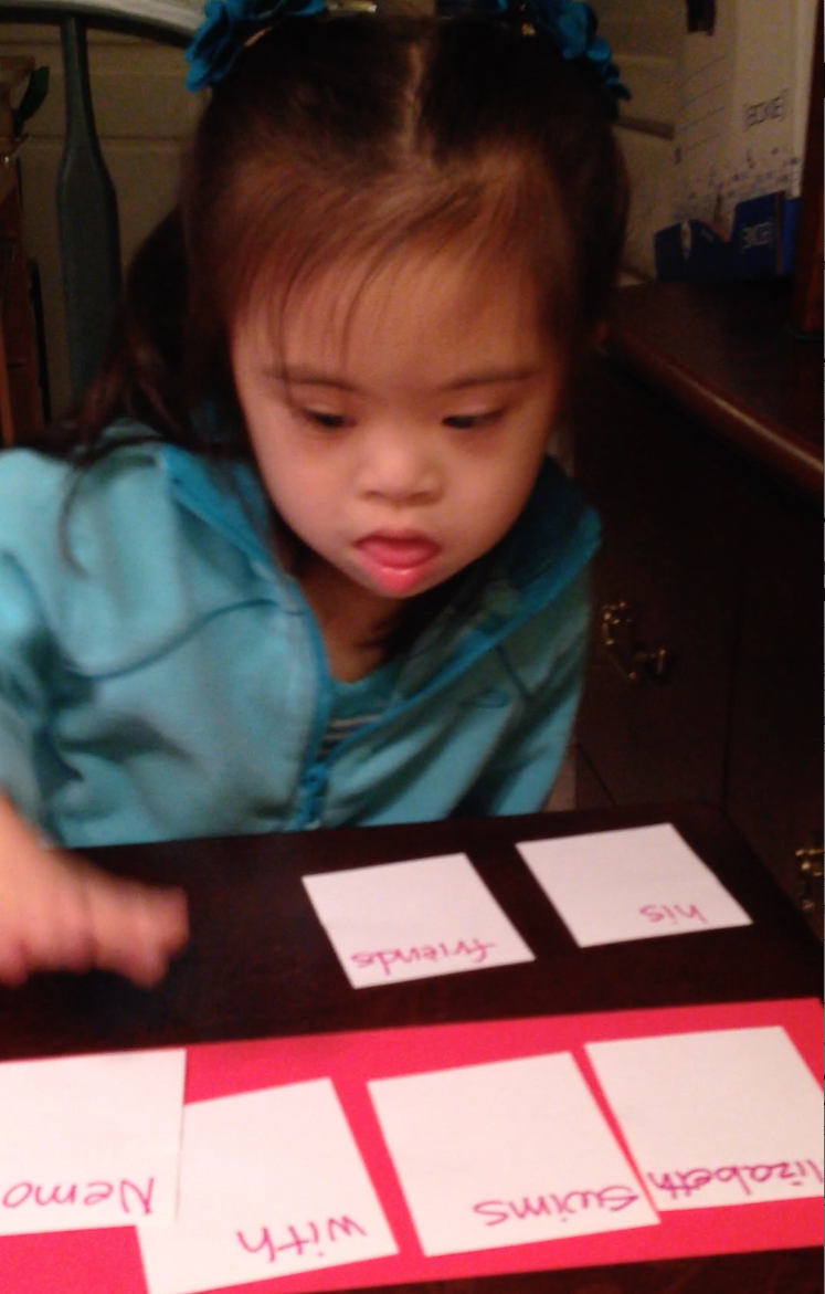 Because she was truly nonverbal, Elizabeth’s teachers went for very low expectations in the beginning. I coached her mom to make two videos of Elizabeth and burn them on a DVD for the teachers. The first was a video of her making the signs for each word in the story she would be reading in the second video (our learners with DS are often…umm…”creative” in their renditions of signs! I wanted to make sure the educators knew her versions of those signs.) The second video was of her signing each word as her mom pointed silently to each. As you can imagine, things shifted dramatically for Elizabeth when her teachers viewed the DVD. Of course.